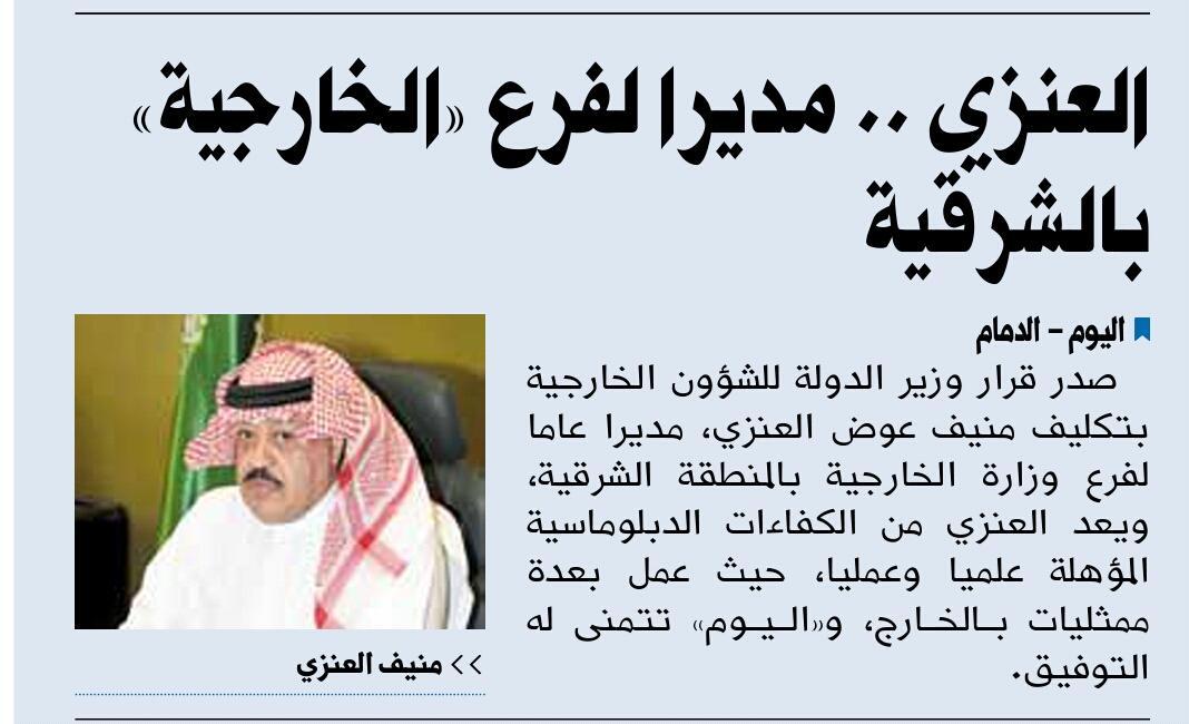 أخبار مدينة الدمام On Twitter منيف العنزي مديرا لفرع وزارة الخارجية بالمنطقة الشرقية Http T Co Nacz8yunpp