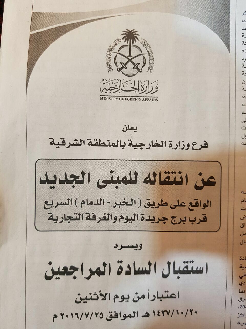 صحيفة الدمام T D On Twitter تنويه يعلن فرع وزارة الخارجية بالمنطقة الشرقية عن انتقاله للمبنى الجديد قرب برج جريدة اليوم اعتبارا من ٢٠ ١٠ ١٤٣٧